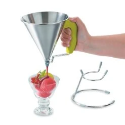 L’entonnoir est dotĂ© d’un support inox et silicone pour poser votre ustensile en cours de rĂ©alisation ou lors de son remplissage. Sa poignĂ©e ergonomique en polyamide assure une bonne prise en main. L’entonnoir Ă piston passe au lave-vaisselle.