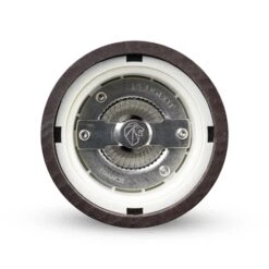 Le bouton de serrage pour le réglage de la mouture est en laiton chromé. Le corps du moulin est en bois de hêtre.