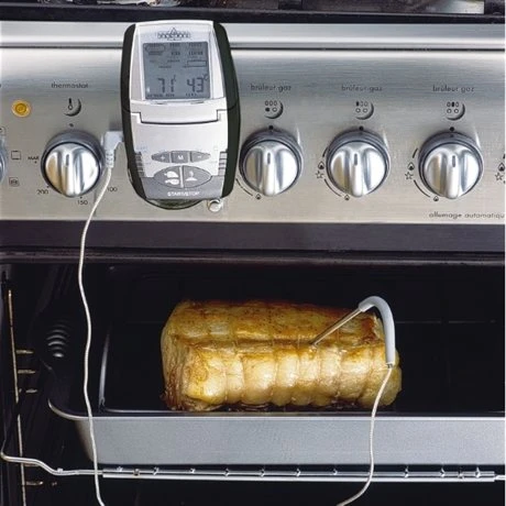 La thermo-sonde de cuisson Mastrad contrĂ´le au degrĂ© près la cuisson de vos viandes, poissons et lĂ©gumes sans ouvrir la porte de votre four. Il vous suffit de sĂ©lectionner le type d’aliment et la cuisson que vous dĂ©sirez, de planter l’aiguille, d’enfourner et de refermer la porte du four sur votre cordon. La thermo-sonde dispose de cinq programmes automatiques pour les viandes et d’un programme manuel pour les poissons et autres types d’aliments. Elle fonctionne jusqu’Ă +210°C. CaractĂ©ristiques techniques : plastique et silicone.